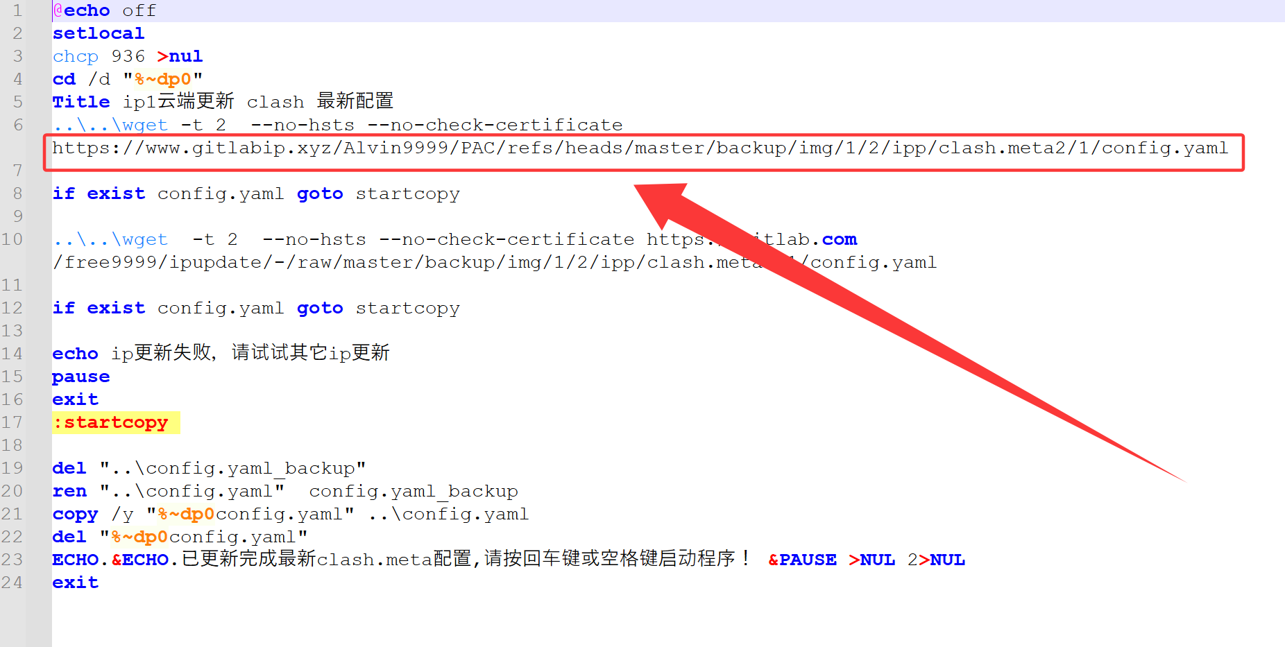 解压出来里面的内容,进入目录\ChromeGo\clash.meta\ip_Update,里面有ip_1.bat,我们右击,用文本格式打开,我们在第六行可以看到我们需要的订阅地址: