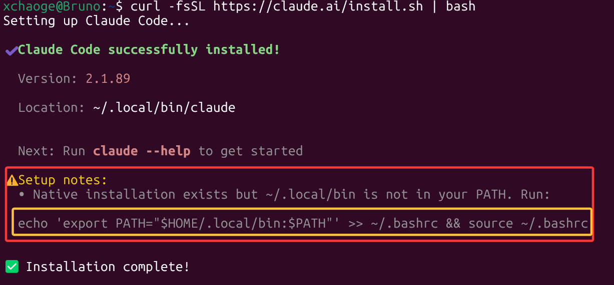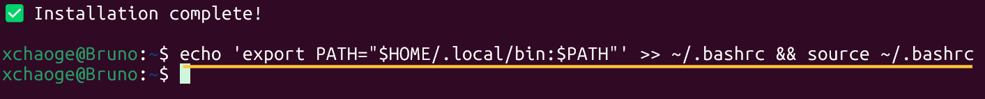 比如我的是echo 'export PATH="$HOME/.local/bin:$PATH"' >> ~/.bashrc && source ~/.bashrc,我执行的内容如下图: