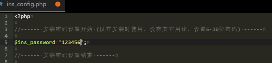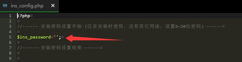 上图红色箭头指的位置,就是要设置安装程序密码的地方,在''里输入你的密码就行了,比如:$ins_password='123456';,这样安装程序进入的密码就是123456。