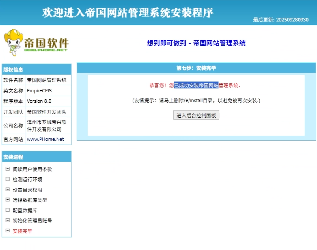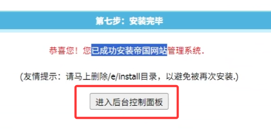 到这里,程序我们就安装完成了,我们点“进入后台控制面板”:
