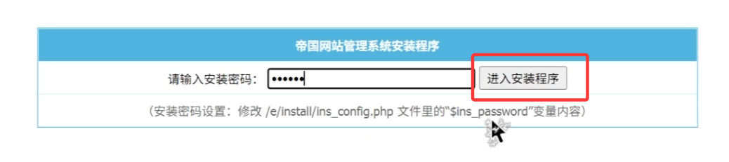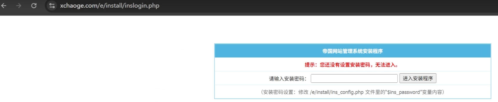然后我们进入https://www.xchaoge.com/e/install/index.php安装网页,刷新页面,输入刚刚设置的密码,点击“进入程序安装”:
