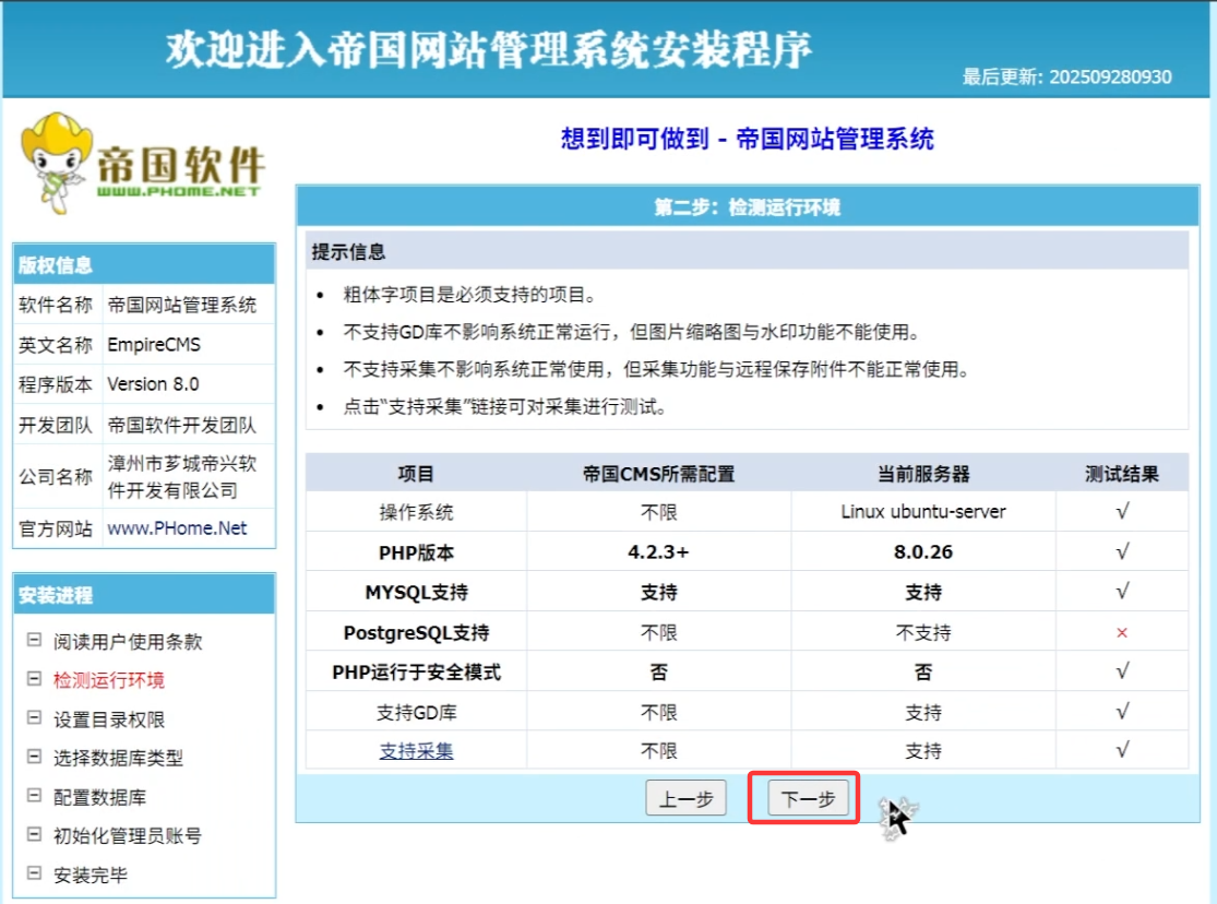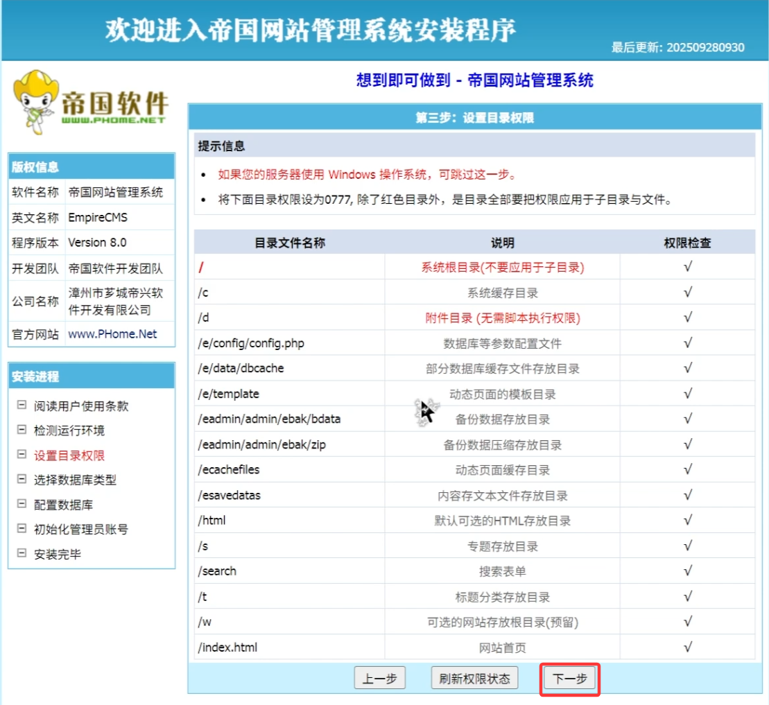 然后我们就来到了第三步,第三步这里是网站目录权限,如果出现红叉,可以去设置成755就行了,我们继续点“下一步”: