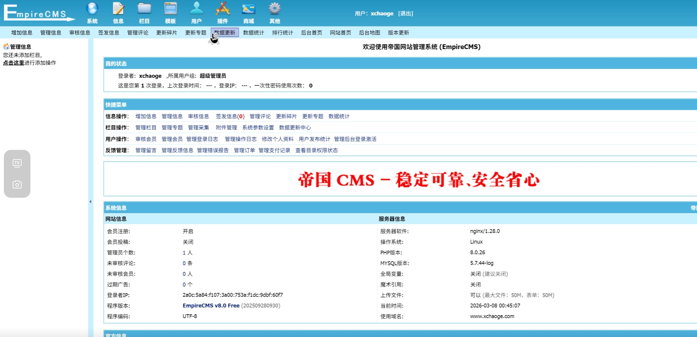 到这里,帝国cms网站程序,我们就安装好了,网站后台的使用,需要日常里摸索,因为帝国cms功能强大,强大的代价就是后台有点繁琐,需要慢慢去熟悉。
