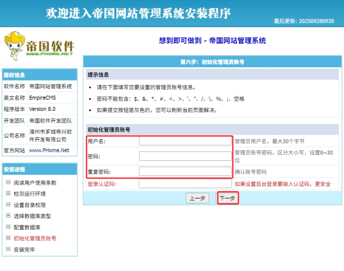 运行结束之后,会出现上面页面,这就来到了第六步,我们设置一下网站程序的账号密码,我们继续点“下一步”: