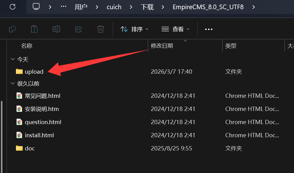 打开解压得到的文件夹之后,我们可以看到里面有一个upload文件夹,这个就是我帝国cms的安装程序,我们把upload里面的内容,全部上传到要安装的网站根目录