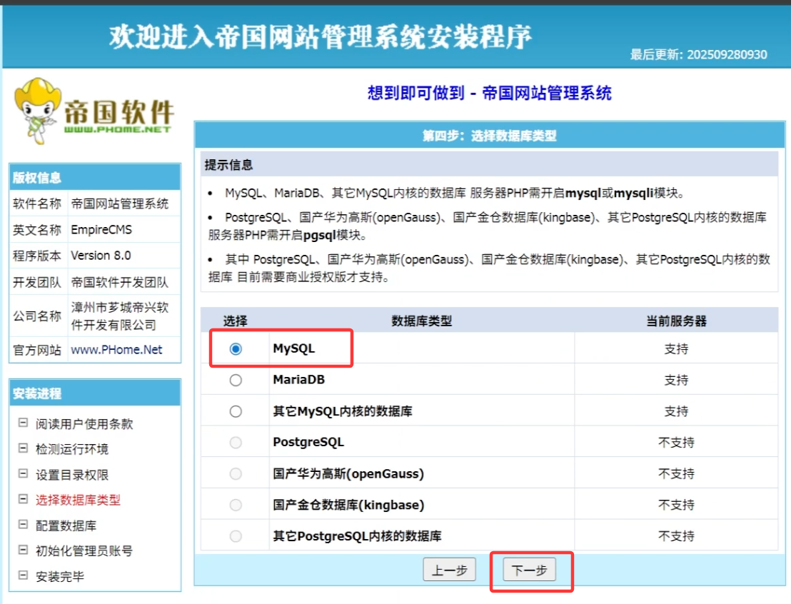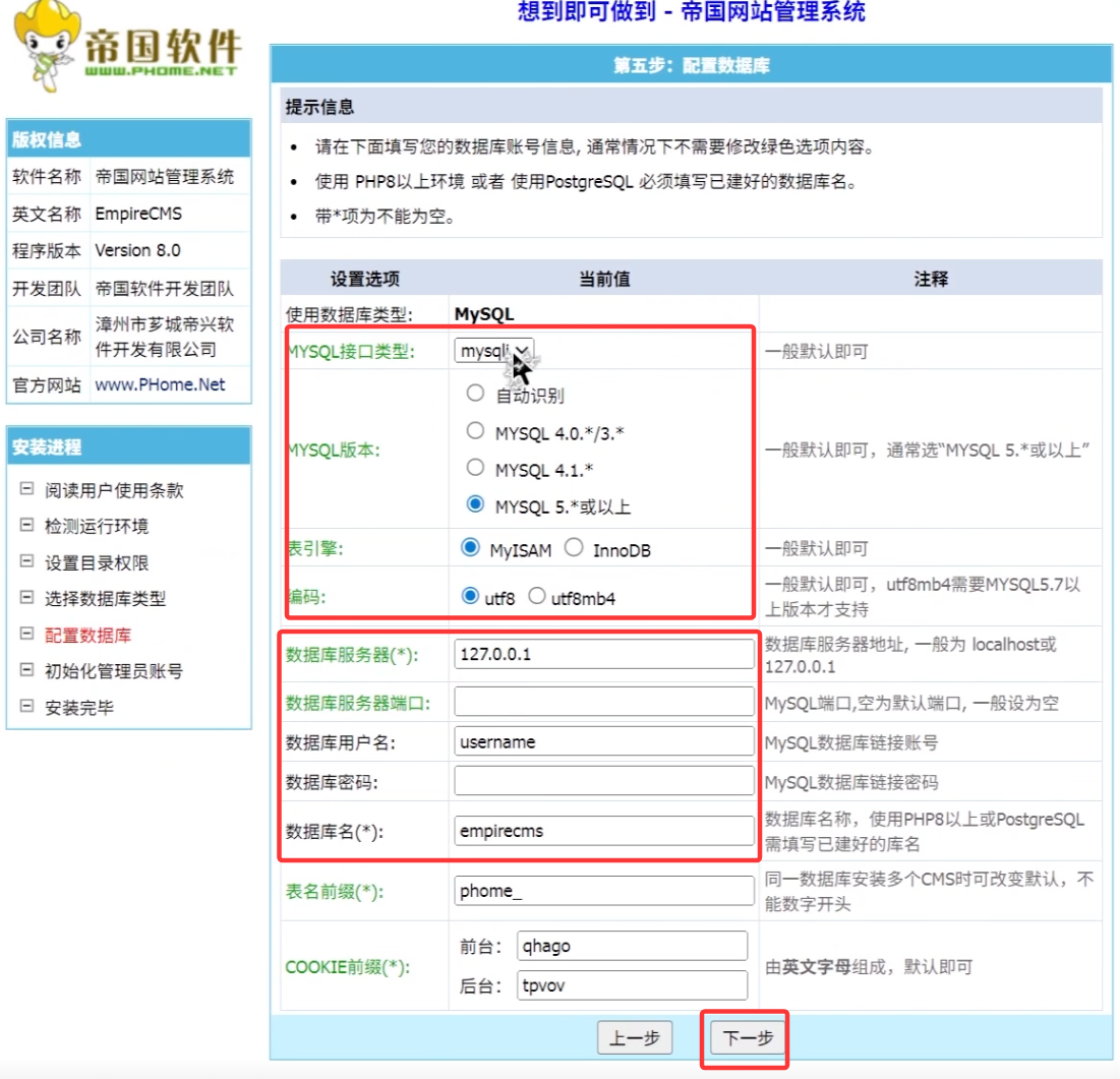 然后我们就来到了第五步,数据库的设置,数据库设置页面的上面红框部分是第四步设置之后,这里自动选中的,一般不用管,下面的红框是数据库的设置,填入自己的数据库信息就行。还有一点要说,那个表前缀是可以自定义修改的,比如默认是phome_,我们可以随便修改phome,比如我修改成了xchaoge_,当然不能有特殊符号。第五步内容填好之后,我们继续点“下一步”: