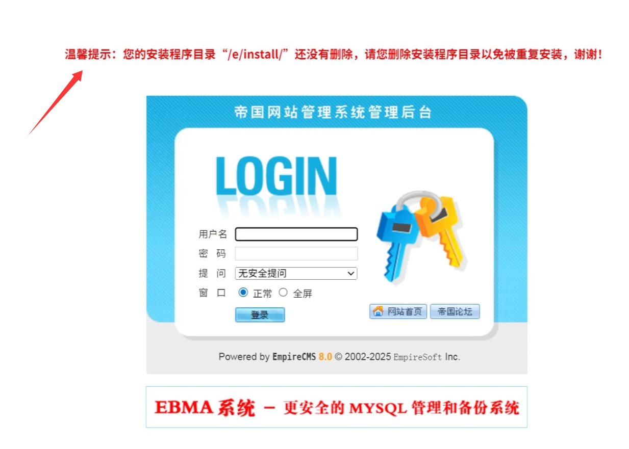 然后我们就来到了管理员登录页面,这个页面上面有个温馨提示,让删除程序安装目录,我们进入服务器网站根目录,把/e/install/目录里面的所有内容删除就行了,然后我们在账号密码的地方,输入刚刚设置的账号密码,这样我们就进入了帝国cms网站程序的后台: