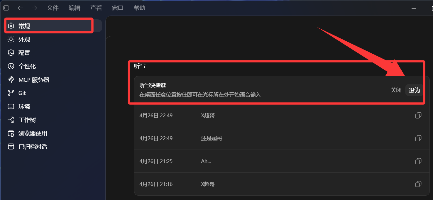 2. 设置听写快捷键: 常规 → 听写 → 设为,设置快捷键