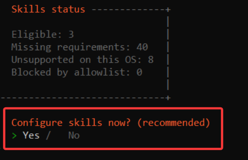 然后来到了下图的“是否现在配置 Skills(技能)”,这里选择"Yes",不然很多功能不能用: