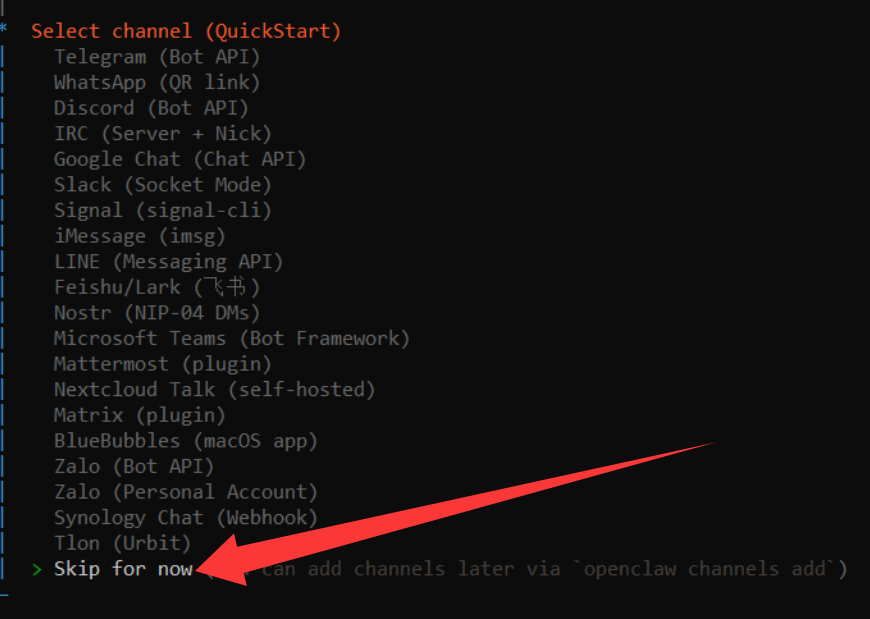 选中之后,会跳到选择的“OpenClaw 要接入哪个聊天平台”(下图),这里直接选最后一个“Skip for now(直接跳过)”,可以后面我们安装好了在配置: