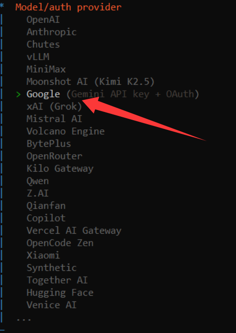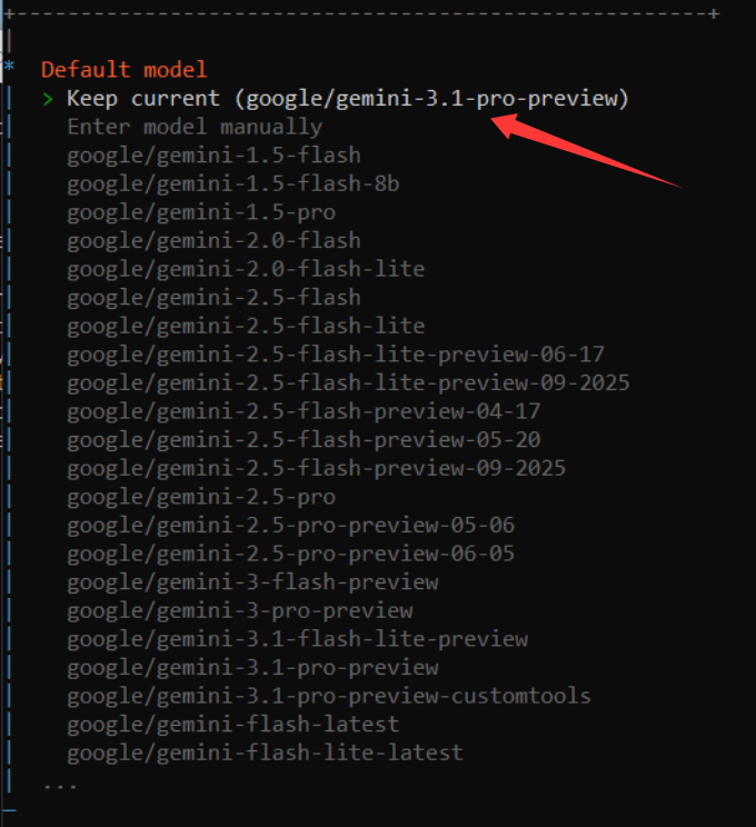 然后就来到了选择Google Gemini 模型的地方(下图),我就默认选择"google/gemini-3.1-pro-preview":