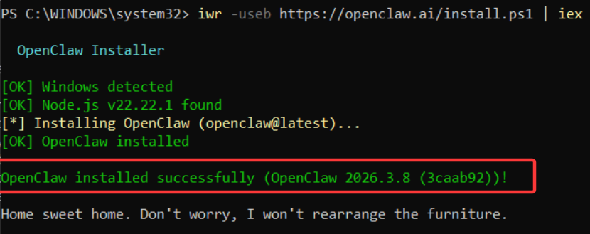 当出现下图红圈里的"OpenClaw installed successfully"的时候,说明安装成功了!