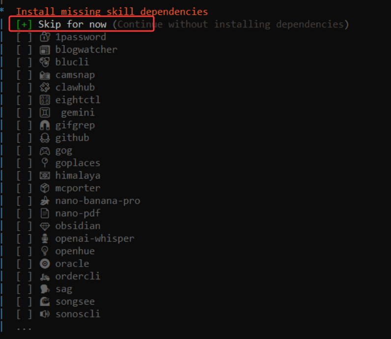 选择之后,我们就来到了下图的"Install missing skill dependencies(安装缺失的技能依赖)",直接选默认的“Skip for now(直接跳过)”就行了,按“空格键”变成+,就可以选中了,然后按“Enter键”: