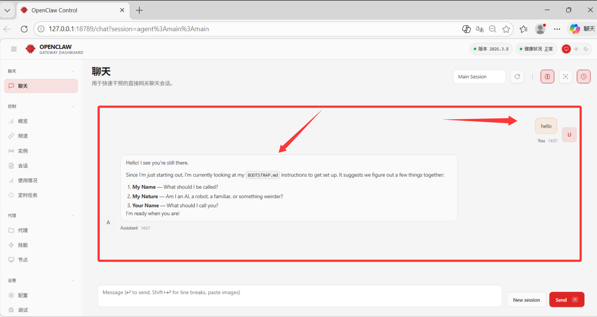 然后就会弹出浏览器网页,我们在输入框输入“hello”,可以看到OpenClaw给了回应,说明OpenClaw已经安装成功。