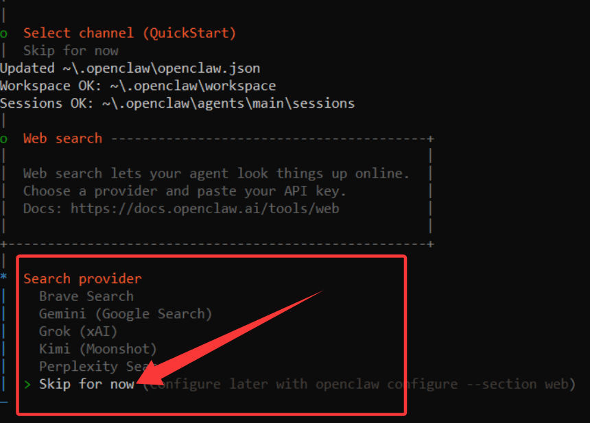然后来到了下图中的联网搜索配置,一样直接选最后一个“Skip for now(直接跳过)”: