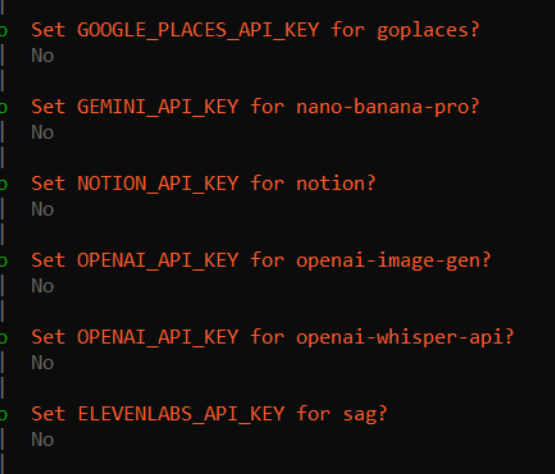 然后就来到了下图的设置特殊技能的地方,这些前期用不到,后面用到了再设置,因为这里都需要api key,所以全部直接选择"No":