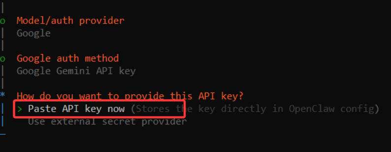 然后就来到了选择API key的输入方式(下图),我们选中"Paste API key now",就是现在粘贴API key,按Enter键:
