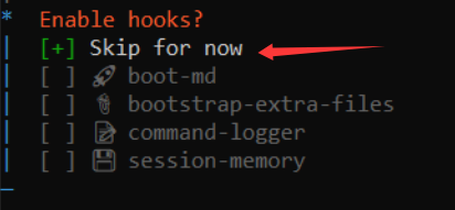 然后就来到了下图的启用 Hooks(钩子功能)的地方,设置了之后会自动执行一些动作,直接选默认的“Skip for now(直接跳过)”就行了,按“空格键”变成+,就可以选中了,然后按“Enter键”:
