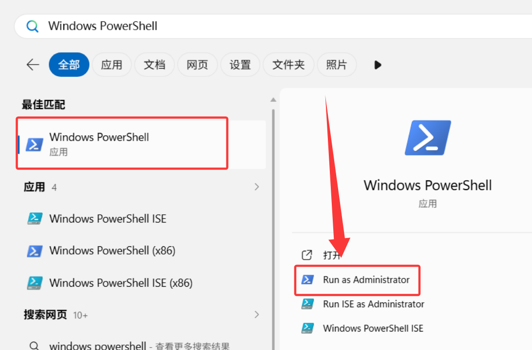 在电脑里按Win键,在弹出的搜索框里输入“Windows PowerShell”查找,然后点击红色箭头位置的“以管理员身份运行(Run as Administrator)”