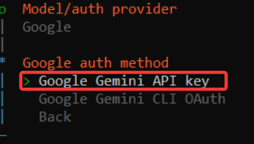 进入Google模型之后,如下图,就进入了选择接口类型,这里选择Google Gemini API key,按Enter键: